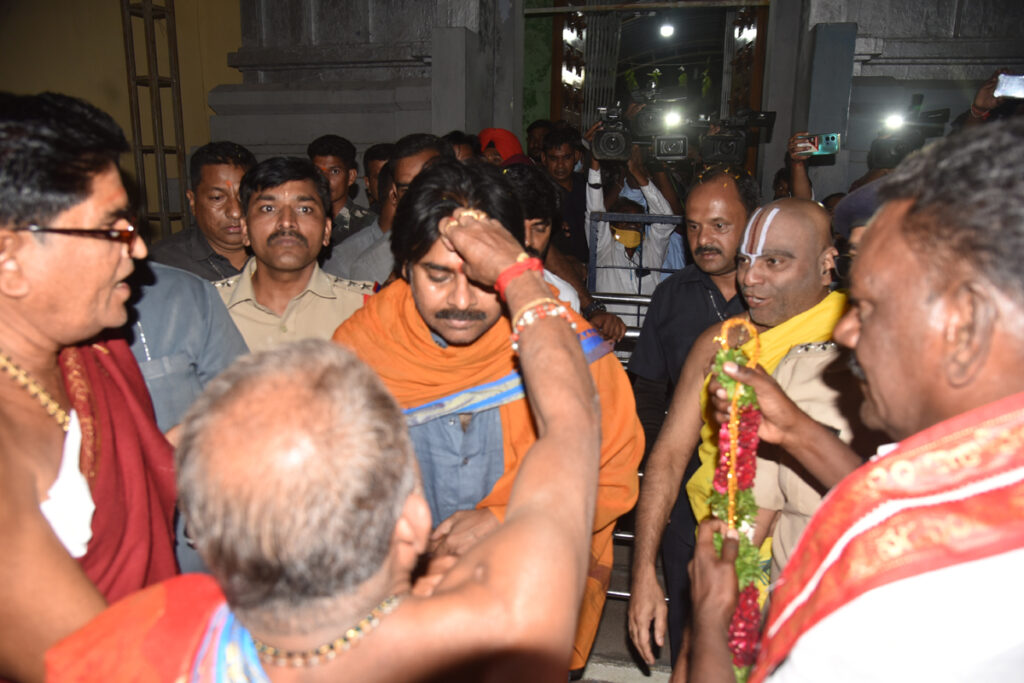 కొండగట్టు నుంచి సాయంత్రం 6 గంటలకు ధర్మపురి క్షేత్రానికి ఆయన చేరుకున్నారు. వేద పండితులు, ఆలయ కమిటీ సభ్యులు, కార్యనిర్వహణాధికారి, సిబ్బంది పవన్ కళ్యాణ్ వేసి మంగళ వాయిద్యాలు వేదమంత్రాల తో స్వాగతించారు.