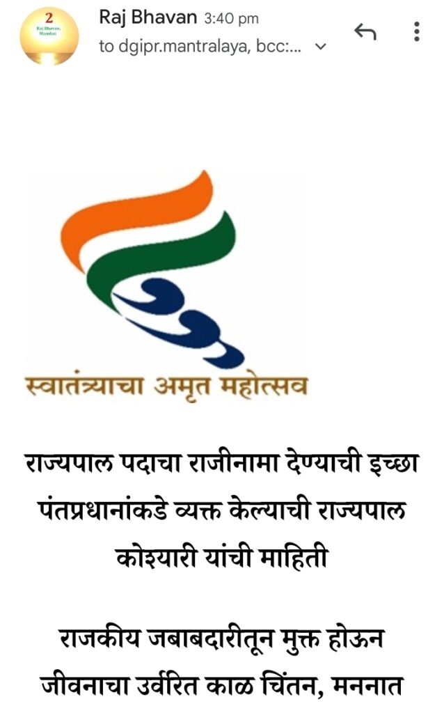 మహారాష్ట్ర గవర్నర్ భగత్ సింగ్ కోష్యారీ ఇటీవల ముంబై పర్యటనలో ప్రధాని నరేంద్ర మోడీకి రాజకీయ బాధ్యతల నుండి వైదొలగాలనే కోరికను తెలియజేసినట్లు తెలిపారు.