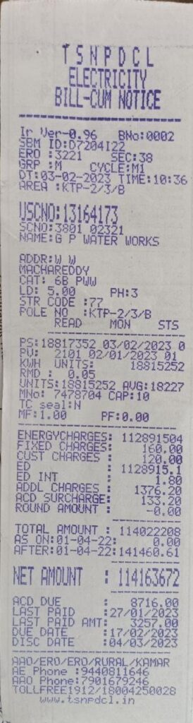 జిల్లాలోని కొత్తపల్లి గ్రామ పంచాయతీ అధికారులకు విద్యుత్ శాఖ వారు ఇచ్చిన బిల్లును చూసి అధికారులతో పాటు పాలకవర్గ సభ్యులు షాక్ కు గురి అయ్యారు. మొత్తం బిల్లు రూ.11,41,63,672. (పదకొండు కోట్ల నలుబది ఒక్క లక్షల, 63 వేల 672 రూపాయలు)