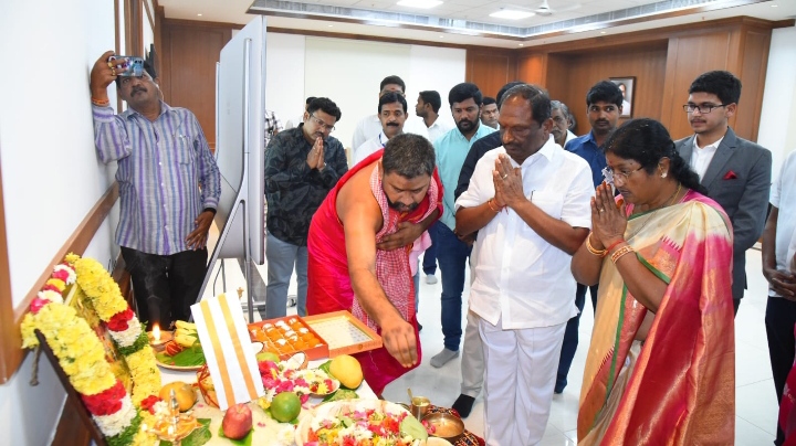 ధర్మపురి క్షేత్రానికి చెందిన వేద పండితులు కాసర్ల వంశీ శర్మ, సంఘనపట్ల దిలీప్ శర్మ ఆధ్వర్యంలో మంత్రి కొప్పుల ఈశ్వర్ చాంబర్ లో ప్రత్యేక పూజలు చేశారు.