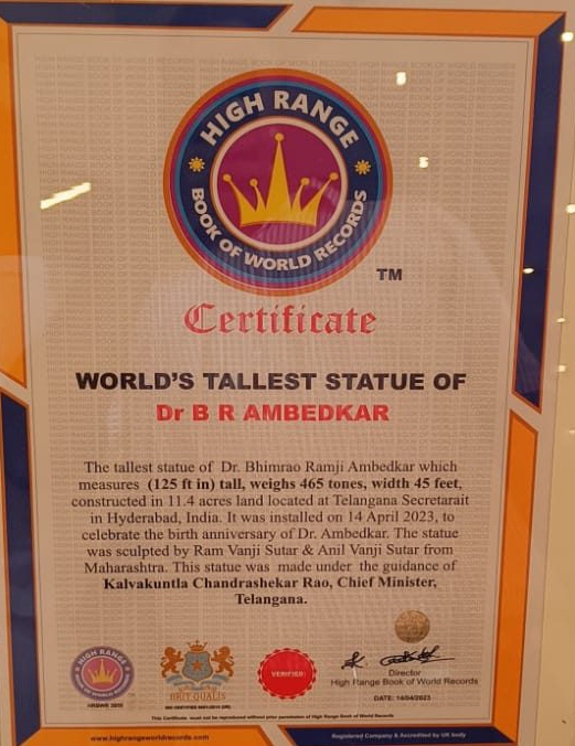 హైదరాబాద్ నగరం నడిబొడ్డున అత్యంత ఎత్తైన భారత రాజ్యాంగ నిర్మాత డాక్టర్ బీఆర్ అంబేద్కర్ విగ్రహం ఏర్పాటు చేసినందుకు తెలంగాణ ప్రభుత్వాన్ని అభినందిస్తూ.. దేశ వ్యాప్తంగా ప్రశంసల పరంపర కొనసాగుతుంది. హైరేంజ్ బుక్ ఆఫ్ వరల్డ్ రికార్డ్స్లో డాక్టర్ బీఆర్ అంబేంద్కర్ విగ్రహం నమోదు అయ్యింది.