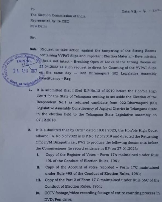 హైకోర్టు ఆదేశాలతో ఆదివారం చేపట్టిన ధర్మపురి ఎన్నికల కౌంటింగ్ వ్యవహారం కి సంబందించి స్ట్రాంగ్ రూం తాళాలు లేకపోవడం, కౌంటింగ్ సమయంలో రికార్డ్ చేసిన విడియో ఫుటేజ్, మరియు సిసి టివి ఫుటేజ్ లేకపోవడం, స్ట్రాంగ్ రూం లోపల ట్రంకు పెట్టెలు సరైన క్రమంలో లేకపోవడం, వాటిలో కొన్ని బాక్సులకు మాత్రమే తాళాలు వేసి ఉండటం, తదితర అంశాలపై ఫిర్యాదుదారుడు కాంగ్రెస్ అభ్యర్థిగా పోటీ చేసిన అడ్డూరి లక్ష్మణ్ కుమార్, సోమవారం భారత ఎన్నికల కమిషన్ కు ఫిర్యాదు చేశారు.