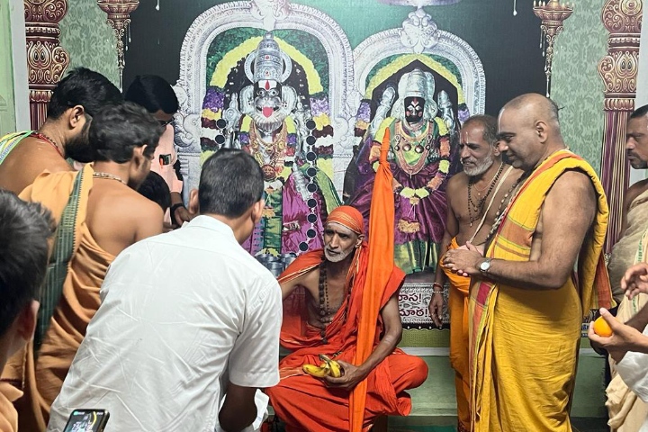 పీఠాధిపతికి ముందుగా దేవస్థానం పక్షాన పూర్ణకుంభం, మేళతాళాలతో స్వాగతం పలికి పూజల అనంతరం అర్చకులు ఆశీర్వచనం ఇచ్చిన తదుపరి దేవస్థానం రెనవేషన్ కమిటి చైర్మన్ ఇందారపు రామయ్య శేష వస్త్రం ప్రసాదం అందజేశారు.