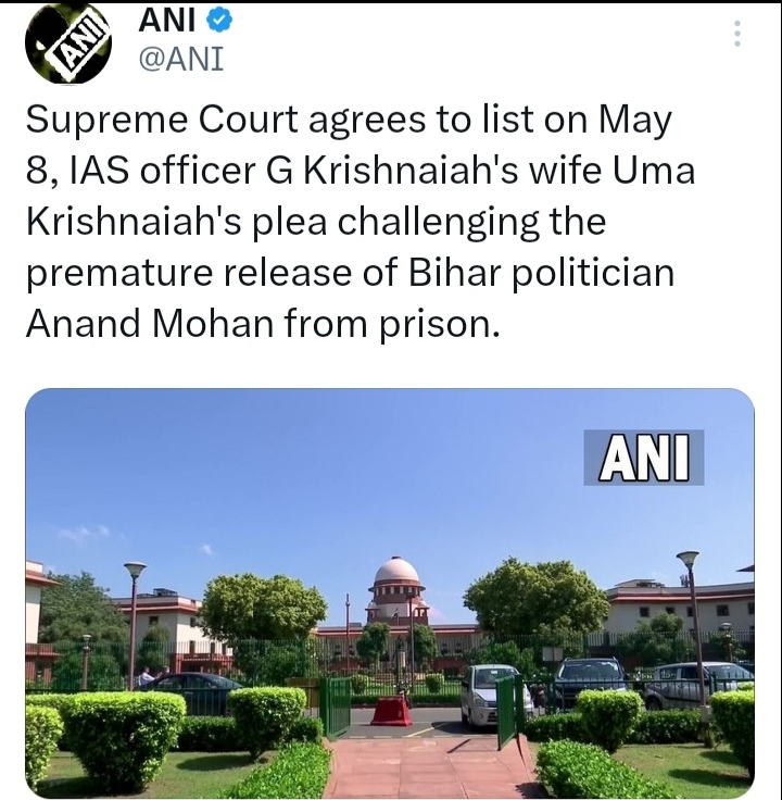1994 లో హత్యకు గురి అయిన ఐఏఎస్ అధికారి కృష్ణయ్య భార్య తన భర్త హత్యకు సహకరించి జైలు శిక్ష అనుభవిస్తున్న మాజీ ఎంపీ మోహన్ సింగ్ విడుదలపై అభ్యంతరాలు, ఆక్షేపణం వ్యక్తం చేస్తూ బీహార్ ప్రభుత్వం తీరుపై ఆమె సుప్రీంకోర్టు తలుపులు తట్టింది. ఈ మేరకు సుప్రీంకోర్టు సోమవారం ఆమె పిటిషన్ స్వీకరించి మే 8న లిస్టింగ్ చేసినట్టు ANI వార్త సంస్థ కథనం.