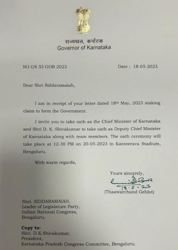 కర్ణాటక ముఖ్యమంత్రిగా సిద్ధరామయ్య, ఉప ముఖ్యమంత్రిగా, డీకే శివకుమార్ శనివారం ప్రమాణ స్వీకారం చేయనున్నారు. మధ్యాహ్నం 12.30 గం.కు బెంగళూరులోని కంటిరవ స్టేడియంలో కర్ణాటక గవర్నర్ థావర్చంద్ గెహ్లాట్ వారితో ప్రమాణ స్వీకారం చేయించనున్నారు..