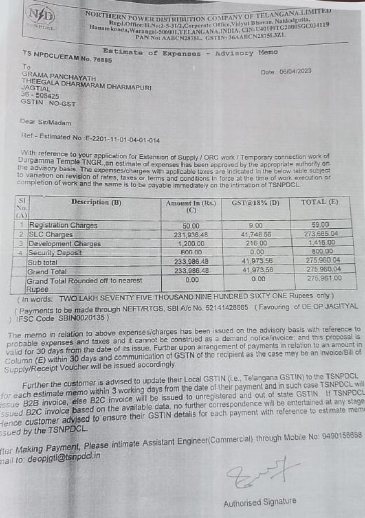 గత నెల రోజుల క్రితం విద్యుత్ శాఖ కార్యాలయం వారు తీగల ధర్మారం గ్రామపంచాయతీ కి ,దుర్గమ్మ ఆలయానికి ఏర్పాటుచేసిన వీధి దీపాలకు సంబంధించిన డబ్బులు ₹ 2 లక్షల 75 వేల, 961 రూపాయలు చెల్లించాలని, (ఇందులో రిజిస్ట్రేషన్, SLC, డెవలప్మెంట్ , చార్జీలు సెక్యూరిటీ డిపాజిట్ల వివరాలు పేర్కొన్నట్టు సమాచారం) గ్రామపంచాయతీకి ఆదాయమే అంతతే.