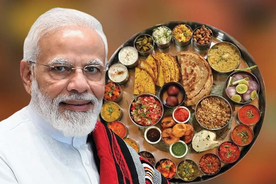 చెఫ్ శ్రీపాద్ కులకర్ణి, తయారుచేసిన ‘మోడీ జీ థాలీ’ లో ఖిచ్డీ, రసగుల్లా, సర్సన్ కా సాగ్, కాశ్మీరీ దమ్ ఆలూ, ఇడ్లీ , ధోక్లా , చాచ్, మరియు పాపడ్ వంటి ఇతర వంటకాలు ఉంటాయి.