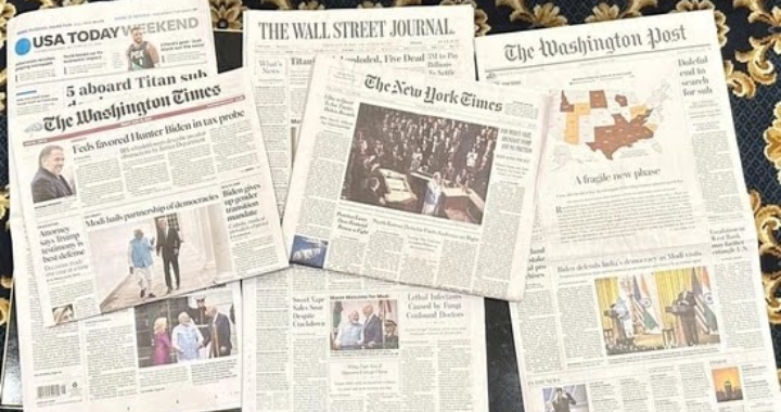 ప్రముఖ అమెరికన్ వార్తాపత్రికలు, ప్రధానమంత్రి నరేంద్ర మోడీ అమెరికా పర్యటనను బ్రహ్మరథం పడుతూ హైలైట్ చేశాయి, (యుఎస్ లైవ్ అప్డేట్స్లో ప్రధాని మోదీ) రెండు దేశాల మధ్య సంతకం చేసిన సాంకేతికత మరియు రక్షణ ఒప్పందాలపై నివేదికలతో సహా ప్రముఖ కవరేజీతో సహా. ‘ది వాషింగ్టన్ పోస్ట్లోని ‘ పూర్తి పేజీ కవరేజీలో, ‘కాంగ్రెస్కు ముందు ప్రధాని ప్రసంగంలో, మోడీ తన దృష్టిని వృద్ధిపై ఉంచారు’ అని పేర్కొంది. మొదటి పేజీలో “చట్టసభ సభ్యులు మోడీని హౌస్ ఛాంబర్కి ఆప్యాయంగా స్వాగతించారు, ఆయనకు పెద్ద ఎత్తున నిలబడి చప్పట్లు కొట్టారు. ఆయన వేదికపైకి వెళ్లినప్పుడు కరచాలనం చేసేందుకు చట్టసభ సభ్యులు వరుసలో ఉండటంతో గ్యాలరీలో కొందరు ఆయన పేరును జపించారు” అని పలు కథనాలు పేర్కొంది.