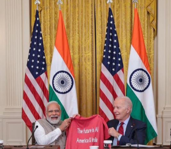 ప్రధాని మోడీ పర్యటన కు సంబంధించిన పూర్తి పేజీ కవరేజ్ పేపర్లో స్ప్లిష్ చేయబడింది, బిడెన్ ఫోటోతో, మోడీ భుజంపై చేయి వేసి, ముందు భాగంలో వాషింగ్టన్ మాన్యుమెంట్తో, ఇద్దరు నాయకులు సెరిమోనియల్ గార్డ్ ఆఫ్ హానర్ను చూస్తున్నారనీ, వేలాది మంది భారతీయులు- వర్షం కురుస్తున్న వైట్ హౌస్ యొక్క సౌత్ లాన్స్ వద్ద గుమిగూడిన అమెరికన్లు. ఫోటోలను ప్రచురించారు. ‘భారతదేశ చరిత్ర బోధనలో ఉంది…’ఉత్సవ స్వాగతం సందర్భంగా వైట్హౌస్లోని సౌత్ లాన్లో జాతీయ గీతాల కోసం ఇద్దరు నాయకులు నిలబడి ఉన్న ఫోటోను ‘ ఫైనాన్షియల్ టైమ్స్ ‘ లో ‘స్ట్రాంగర్ టైస్ బిడెన్’ మరియు మోడీ ప్రజాస్వామ్యాల మధ్య ‘నిర్వచించే’ సంబంధానికి కట్టుబడి ఉన్నారు’