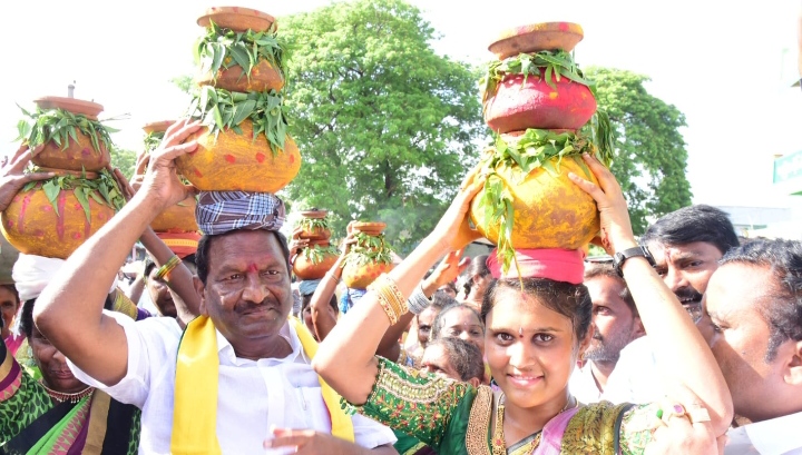 కొప్పుల ఈశ్వర్ బోనం ఎత్తుకొని పోచమ్మకు పూజలు చేశారు.