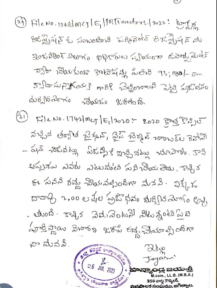👉 ఫైల్ No.G.1 /McJ/2045 12023:- ఇక్కడ మున్సిపాలిటి వారు కొత్తగా ఏ మున్సిపాలిటి వారు కూడ ఉద్యోగులకు డీజిల్ పోసిన దాఖాలాలు లేవు. కాని మన మున్సిపాలిటి వారు జనరల్ ఫండ్ ను ప్రజా అవసరాలకు మౌలిక సదుపాయాలకు వాడాల్సిన మొత్తాన్ని అధికార పక్షం వారు అధికారం ఉంది కదా అని వర్క్, ఇన్స్పెక్టర్లకు, జవాన్లకు మరియు ఇప్పుడు చైన్ మెన్లుకు ప్రతినెలా 15 లీటర్ల పెట్రోలుకు అనుమతిని ఇస్తూ ప్రజాదనం దుర్వినియోగం చేస్తున్నారు. ఎందుకంటే ఇందులో బడుగు అశోక్ పర్మినెంట్ ఉద్యోగి ఇతనికి జీతం వస్తుంది. మిగతా వారందరికి కూడు మున్సిపల్ జీతంతో పాటు అదనంగా పెట్రోలు 15 లీటర్లు ఇది రాజ్యాంగ విరుద్ద చర్య కావున ఈ అంశాలన్నీ రద్దు పరచాలని మనవి.