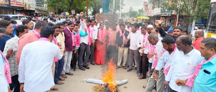 తెలంగాణ రాష్ట్రంలో ఉచిత విద్యుత్ అవసరం లేదని టి పి సి సి అధ్యక్షుడు రేవంత్ రెడ్డి చేసిన వ్యాఖ్యలకు నిరసన గా బుధవారం జిల్లా కేంద్రంలోని తహసీల్ చౌరస్తా వద్ద బి ఆర్ ఎస్ పార్టీ ఆధ్వర్యంలో ధర్నా చేపట్టి రేవంత్ రెడ్డి దిష్టిబొమ్మ దహనం చేశారు.