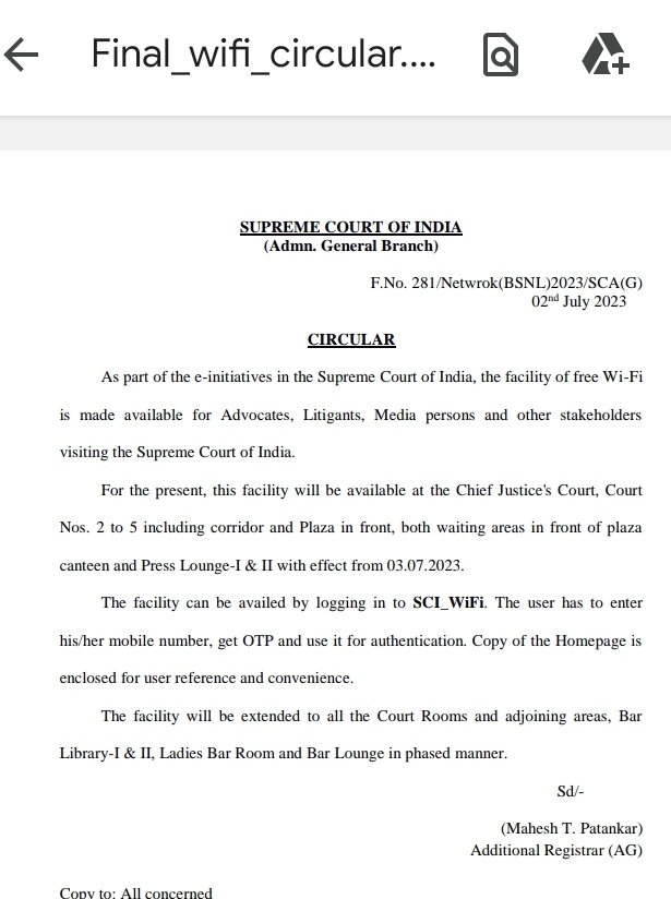 అన్ని కోర్టు గదులు, పరిసర ప్రాంతాలు, బార్ లైబ్రరీలు , లేడీస్ బార్ రూమ్ మరియు బార్ లాంజ్తో సహా దశలవారీగా ఉచిత ఇంటర్నెట్ సదుపాయాన్ని ఇతర ప్రాంతాలకు కూడా విస్తరించాలని నిర్ణయించినట్లు సుప్రీంకోర్టు జారీ చేసిన సర్క్యులర్ పేర్కొంది.