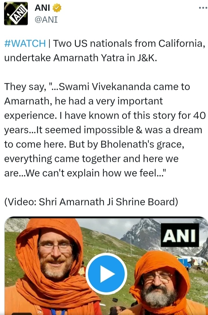 అమర్నాథ్ యాత్ర కోసం జమ్మూ కాశ్మీర్కు వెళుతున్న వేలాది మంది యాత్రికులతో పాటు , కాలిఫోర్నియాకు చెందిన ఇద్దరు అమెరికా పౌరులు మంగళవారం వచ్చారు. స్వామి వివేకానంద స్ఫూర్తితో ఈ పుణ్యక్షేత్రాన్ని సందర్శించడం తో తమ కల నెరవేరిందని, ఈ అవకాశం కోసం ఎన్నో ఏళ్లుగా ఎదురుచూస్తున్నామని వారు ANI వార్త సంస్థకు వివరించారు.