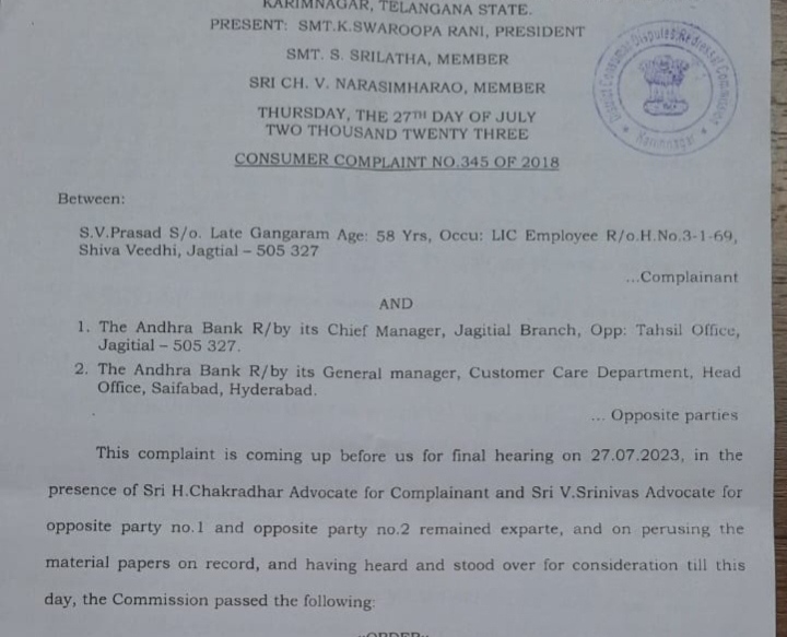 జగిత్యాల్ ఆంధ్ర బ్యాంక్ యాజమాన్యం కు కరీంనగర్ జిల్లా వినియోగదారుల ఫోరం వినియోగదారుడికి ₹50, వేలు జరిమాన చెల్లించాలని, అధికంగా వసూలు చేసిన ₹ 92 వేలు తిరిగి ఇచ్చివేయాలని ఆదేశిస్తూ ఆదేశాలు జారీ చేసింది.