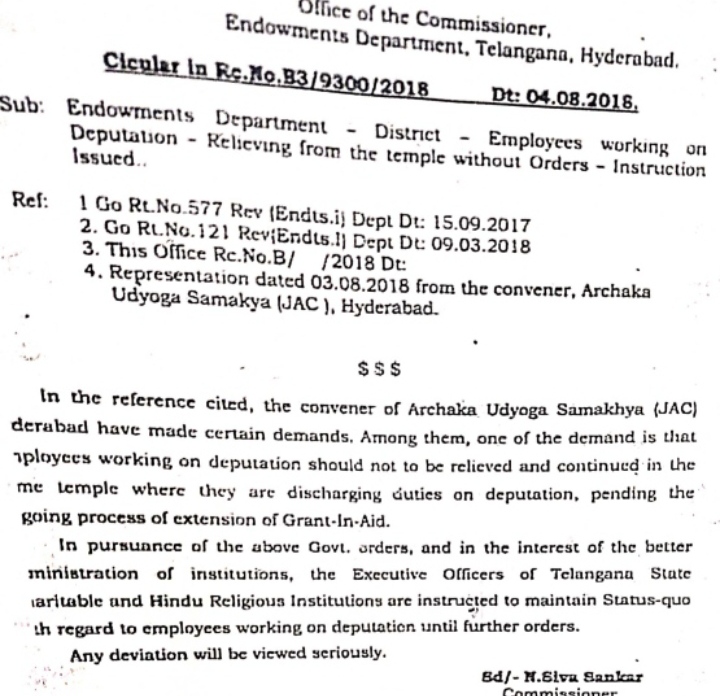 B 3 /9300/ 2018, తేదీ 4-08- 2018 న రాష్ట్ర వ్యాప్తంగా ఆలయాల ఎగ్జిక్యూటివ్ ఆఫీసర్లను ఆదేశిస్తూ జారీచేసిన ఓ సర్కులర్ లో మీ మీ ఆలయాలలో డిప్యూటేషన్లపై కొనసాగుతున్న ఉద్యోగులను, కమిషనర్ అనుమతి, ముందస్తు సమాచారం లేకుండా తిరిగి పంపించరాదని, అందులో పేర్కొన్నారు. అర్చక ,ఉద్యోగ సంఘాల అభ్యర్థన మేరకు, గ్రాంట్ ఇన్ ఎయిడ్ ద్వారా అర్హత కలిగిన ఉద్యోగులు క్రమబద్ధీకరణ నేపథ్యంలో ఈ ఆదేశాలు జారీ చేసినట్టు అందులో పేర్కొన్నారు.