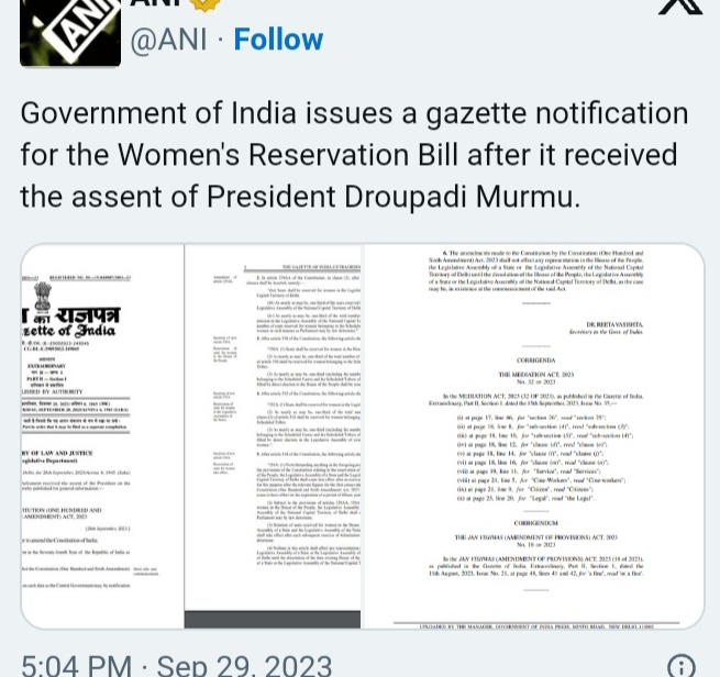 లోక్సభ, శాసన సభల్లో మహిళలకు 33 శాతం రిజర్వేషన్లు కల్పించే ఈ బిల్లుకు ఇటీవలే పార్లమెంట్ ఉభయసభలు ఆమోద ముద్ర వేశాయి. రాష్ట్రపతి ఆమోదం తర్వాత ఇందుకు సంబంధించి కేంద్ర న్యాయ మంత్రిత్వ శాఖ గెజిట్ నోటిఫికేషన్ విడుదల చేసింది. 106వ రాజ్యాంగ సవరణ ద్వారా చట్ట సభల్లో మహిళలకు కేంద్రం 33శాతం రిజర్వేషన్లు కల్పించింది.
