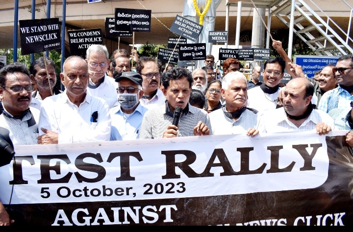 కేంద్రంలో ప్రభుత్వం అప్రకటిత ఎమర్జెన్సీని అమలు చేస్తూ మీడియా మీద, పౌర సంస్థల మీద ఉక్కుపాదం మోపడం సహించారనిదన్నారు. ‘న్యూస్ క్లిక్ పోర్టల్’ కార్యాలయంపై, అందులో పని చేస్తున్న 47 మంది జర్నలిస్టులపై ఢిల్లీ పోలీసులు దాడులు జరిపిన తీరు దిగ్బ్రాంతి కలిగిస్తున్నదన్నారు. ఎందుకు సోదాలు జరుపుతున్నారో, ఎందుకు అరెస్టులు చేస్తున్నారో తెలపకుండా చీకటి రోజులను గుర్తు చేసే విధంగా ఢిల్లీ స్పెషల్ బ్రాంచ్ పోలీసులు వ్యవహరించారని వారు ఆరోపించారు. కఠినమైన ఉపా చట్టం కింద కేసులు నమోదు చేస్తున్నామని చెప్తున్న పోలీసులు ముందుగా ఎఫ్ఐఆర్ ఎందుకు దాఖలు చేయడం లేదో చెప్పడం లేదని ఆరోపించారు. చైనా పెట్టుబడులను బూచిగా చూపి ప్రజాస్వామ్యాన్ని హరించాలని చూస్తున్నారని ఆరోపించారు. కారణం చెప్పకుండా అరెస్టు చేయడం ప్రాథమిక హక్కుకు భంగం కలిగించడమేనని సుప్రీంకోర్టు మాజీ ప్రధాన న్యాయమూర్తి జస్టిస్ కే.సుదర్శన్ రెడ్డి వ్యాఖ్యానించారు. ఇందిరా గాంధీ హయాంలో 1975లో ప్రకటిత ఎమర్జెన్సీ అమలు కాగా నేడు నరేంద్ర మోడీ పాలనలో అప్రకటి ఎమర్జెన్సీని అమలు చేస్తూ ప్రజాస్వామ్య సంస్థలను నిర్వీర్యం చేస్తున్నారని ఆయన ఆవేదన వ్యక్తం చేశారు. మానవ హక్కుల నేత, ప్రముఖ రచయిత ప్రొఫెసర్ హరగోపాల్ మాట్లాడుతూ దేశంలో కొనసాగుతున్న నిర్బంధకాండ ప్రమాదకర పరిస్థితులను సూచిస్తోందని వ్యాఖ్యానించారు. స్వేచ్ఛ లేని బతుకు అర్థరహితమని, దాన్ని కాపాడాల్సిన ప్రభుత్వం అందుకు విరుద్ధంగా వ్యవహరించడం దురదృష్టకరమని అన్నారు.