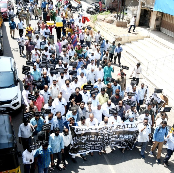 ఇండియన్ జర్నలిస్ట్స్ యూనియన్ (ఐజేయూ), తెలంగాణ రాష్ట్ర వర్కింగ్ జర్నలిస్టుల సంఘం (టీయూడబ్ల్యూజే)ల నేతృత్వంలో, హెచ్.యూ.జే, హైదరాబాద్ ప్రెస్ క్లబ్, నెట్వర్క్ ఆఫ్ ఉమెన్ ఇన్ మీడియా ఇండియా, తెలంగాణ ఫోటో జర్నలిస్ట్స్ అసోసియేషన్, తెలంగాణ చిన్న, మధ్యతరహా పత్రికలు మరియు మేగజైన్స్ అసోసియేషన్ ల భాగస్వామ్యంతో భారీ నిరసన ప్రదర్శన జరిగింది. బషీర్ బాగ్ లోని టీయూడబ్ల్యూజే కార్యాలయం నుండి ప్రారంభమైన ఈ ప్రదర్శన ట్యాంక్ బండ్ లోని అంబేద్కర్ సర్కిల్ కు చేరుకుంది.