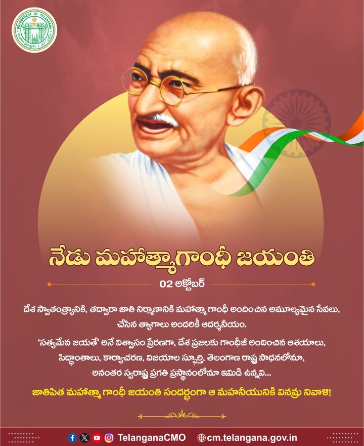 సత్యమేవ జయతే’ అనే విశ్వాసం ప్రేరణగా, దేశ ప్రజలకు గాంధీజీ అందించిన ఆశయాలు, సిద్ధాంతాలు, కార్యాచరణ, విజయాల స్ఫూర్తి, తెలంగాణ రాష్ట్ర సాధనలోనూ, అనంతర స్వరాష్ట్ర ప్రగతి ప్రస్థానంలోనూ ఇమిడి వున్నవని సీఎం కెసిఆర్ అన్నారు.
