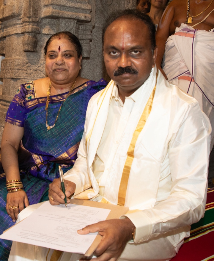 తిరుమల ఆలయ ప్రధాన అర్చకుల్లో ఒకరైన వేణుగోపాల దీక్షితులు ఆయనకు శ్రీవేంకటేశ్వర స్వామివారి పీఠాధిపతి విశిష్టతను తెలియజేశారు. దర్శనానంతరం నూతన ఈఓకు వేదపండితులు వేదాశీర్వచనం అందించి తీర్థప్రసాదాలు, శ్రీవారి ల్యామినేట్ ఫొటో తదితరాలను అందజేశారు.