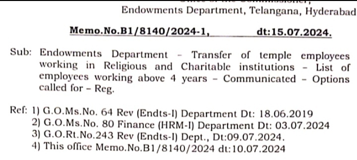 ఈనెల 15న మెమో సంఖ్య B1/8140/2024-1. ద్వారా ఉద్యోగుల బదిలీల కోసం ఆలయాలకు సర్కులర్ జారీ చేశారు. ఈ సర్కులర్ లో నాలుగు సంవత్సరాల కాలంకు పైగా ఆయా ఆలయంలో విధులు నిర్వహిస్తున్న ఉద్యోగులు ఇతర ఆలయాల్లో బదిలీకి ఆప్షన్ కోరుతూ తమ సర్వీస్ పూర్తి వివరాలతో దేవాదాయ శాఖకు దరఖాస్తు చేసుకోవాల్సి ఉంటుంది. ప్రతి ఆలయ ఉద్యోగులలో 40 శాతం వరకే మొదటి విడత బదిలీ చేయనున్నట్టు సర్కులర్ పేర్కొనబడింది.