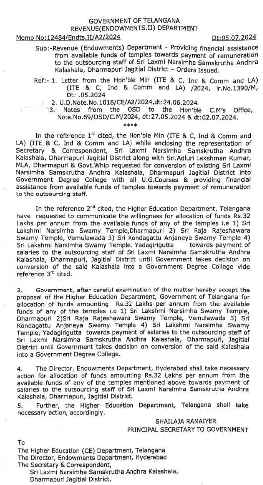 స్పందించిన ప్రభుత్వం శుక్రవారం కళాశాల నిర్వహణకు నిధులు, ఔట్సోర్సింగ్ ప్రాతిపదికన లెక్చరర్ల నియామకం, వారికి జీతభత్యాలు చెల్లించడానికి, ప్రతి సంవత్సరం ₹ 32 లక్షల రూపాయలను ధర్మపురి, వేములవాడ, కొండగట్టు, యాదగిరిగుట్ట ఆలయాలు నిధులు కేటాయిస్తాయని ప్రభుత్వ ఉత్తర్వులో పేర్కొంది. యూనివర్సిటీ గ్రాంట్ కమిషన్ కోర్సులు సైతం ఈ కళాశాలలో విద్యార్థులకు అందుబాటులో ఉంటాయని ప్రభుత్వ ప్రిన్సిపల్ కార్యదర్శి, సీనియర్ ఐఏఎస్ అధికారిని రామ శైలజ అయ్యంగార్ శుక్రవారం జారీ చేసిన ఉత్తర్వులో పేర్కొన్నారు.