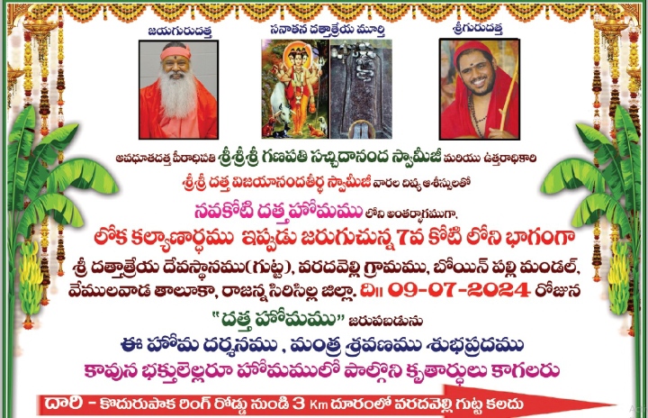 లోక కల్యాణార్ధము ఈనెల 9న సిరిసిల్ల జిల్లా బోయిన్ పెల్లి మండలం వరద వెళ్లి గ్రామ, గుట్టపై స్వయంభు రాహు రూప ( సర్ప రూప) శయన దత్తాత్రే యుడి ఆలయంలో శ్రీ దత్త హోమం జరగనున్నది.