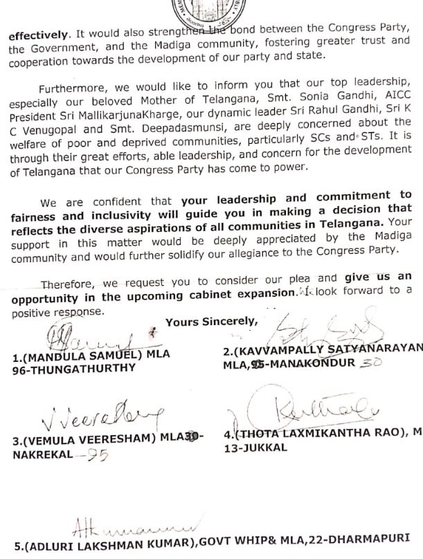 ఇటీవల జరిగిన పార్లమెంట్ ఎన్నికల్లో నాగర్కర్నూల్, పెద్దపల్లి, వరంగల్ నియోజకవర్గాల్లో మాదిగ సామాజిక వర్గానికి చెందిన జనాభా ఎక్కువగా ఉన్నా తెలంగాణాలో కాంగ్రెస్ పార్టీ ఒక్క సీటు కూడా ఇవ్వలేదు. అయినా కాంగ్రెస్ పార్టీకి బేషరతుగా మద్దతిచ్చిందని పేర్కొన్నారు. అయినప్పటికీ, మా విధేయత మరియు గణనీయమైన ఉనికిని కలిగి ఉన్నప్పటికీ, ప్రస్తుత రాష్ట్ర మంత్రివర్గంలో మేము తక్కువ ప్రాతినిధ్యం వహిస్తున్నాము. మాదిగ సామాజికవర్గానికి చెందిన ఒక మంత్రిని మంత్రివర్గంలో నియమించడాన్ని పరిశీలించాలని మేము మిమ్మల్ని కోరుతున్నాము అంటూ పత్రం లో పేర్కొన్నారు.