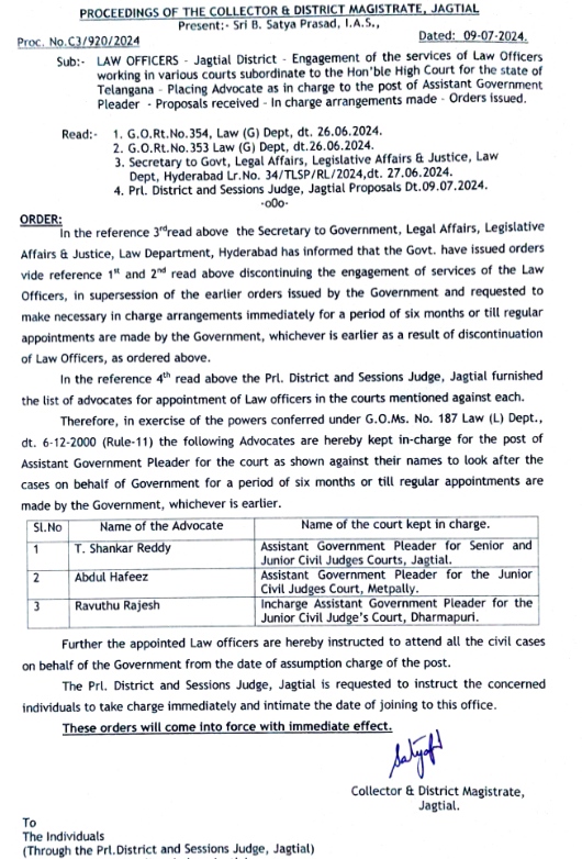 ధర్మపురి జూనియర్ సివిల్ కోర్టు ఇంచార్జ్ అదనపు ప్రభుత్వా న్యాయవాదిగా ప్రభుత్వం రౌతు రాజేష్ ను నియమించింది. ఈ మేర కు జగిత్యాల జిల్లా కలెక్టర్ సత్యప్రసాద్ ఉత్తర్వులు జారీ చేశారు.