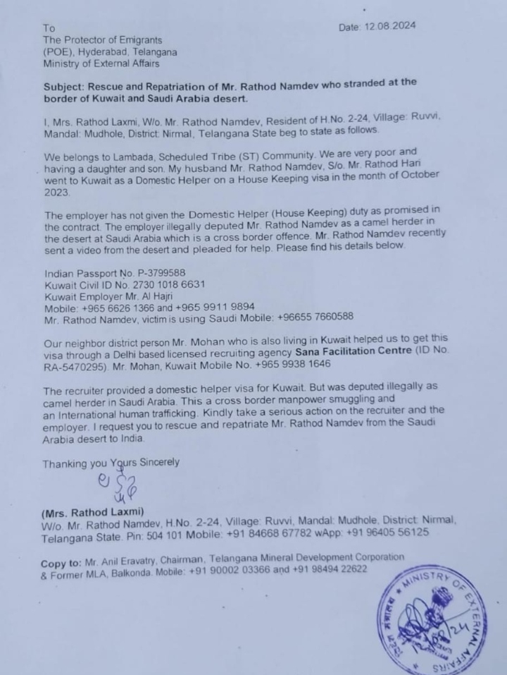 ఢిల్లీ లోని ‘సనా ఫెసిలిటేషన్ సెంటర్’ అనే లైసెన్స్ రిక్రూటింగ్ ఏజెన్సీ ద్వారా రాథోడ్ నాందేవ్ అక్టోబర్ 2023 లో ఇంటిపని వీసాపై కువైట్ కు వెళ్ళాడు. కువైట్, సౌదీ అరేబియా సరిహద్దు లోని ఎడారిలో చిక్కుకుపోయిన తన భర్తను రక్షించి ఇండియాకు తీసుకురావాలని రాథోడ్ నాందేవ్ భార్య లక్ష్మి కన్నీరు మునీరు గా రోధిస్తున్నది.