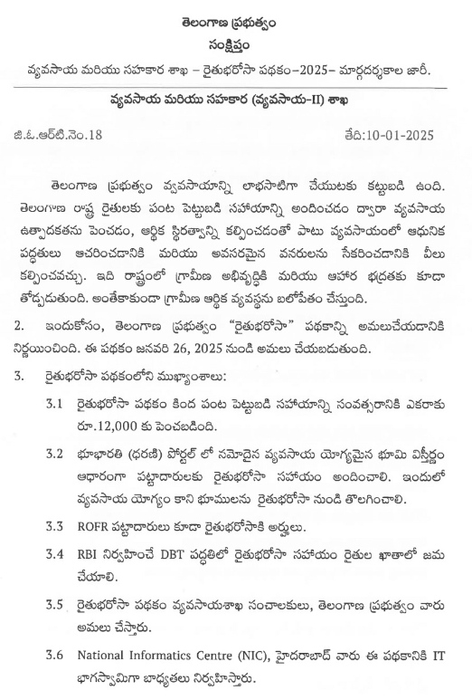 👉 రైతుభరోసా పథకం వ్యవసాయశాఖ సంచాలకులు, తెలంగాణ ప్రభుత్వం వారు అమలు చేస్తారు.