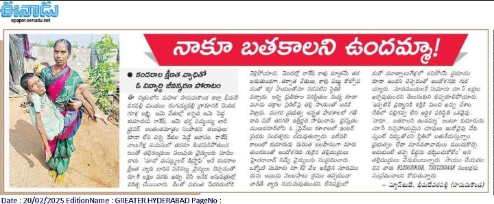👉 ఇటీవల వ్యాధి తీవ్రత పెరగడంతో నడవలేని పరిస్థితికి వచ్చాడు. రాకేష్కు ఆరోగ్యం మెరుగు కావాలంటే ఖరీదైన ఇంజక్షన్లను క్రమం తప్పకుండా ఇవ్వాలని వైద్యులు సూచించారు. పేదరికంలో ఉన్న రాకేష్ కుటుంబం ఖరీదైన వైద్యం చేయించలేకపోతుందని, ఈనాడు దినపత్రికలో వచ్చిన కథనంపై సీఎం రేవంత్ రెడ్డి తక్షణమే స్పందించారు. తమ బిడ్డను ఆదుకోవడానికి స్పందించిన ముఖ్యమంత్రి రేవంత్ రెడ్డికి రాకేష్ తల్లిదండ్రులు గూళ్ల సమ్మయ్య, లక్ష్మి ధన్యవాదాలు తెలిపారు.