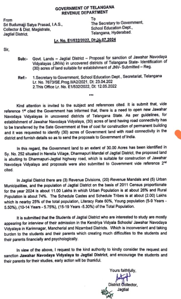 👉 జగిత్యాల జిల్లా కలెక్టర్ లేఖ సంఖ్య E1/532/2022, తేదీ 24-01- 2025 రానున్న విద్య సంవత్సరం లో నవోదయ పాఠశాల నిర్వహణకు నూతనంగా నిర్మితమైన గిరిజన రెసిడెన్షియల్ భవనము తాత్కాలికంగా వినియోగించుకొనుటకు డైరెక్టర్ ఆఫ్ స్కూల్ ఎడ్యుకేషన్ కు లేఖ రాశారు. భవనం నక్ష ను సైతం జతపరిచారు.