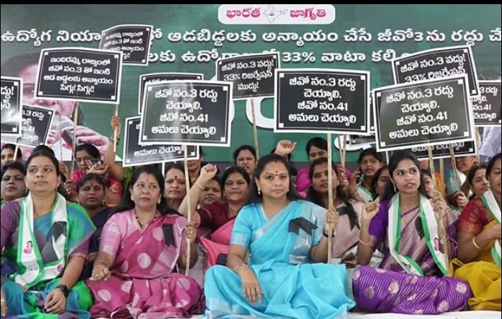 గతంలో మహిళా రిజర్వేషన్లు పోరాటం అంటూ హడావిడి చేస్తూ చట్టసభలో మాకు రిజర్వేషన్ కావాలి అంటూ మీడియా సమావేశాల్లో, ప్రచారం మాధ్యమా ల్లో హిందీ, ఇంగ్లీష్, తెలుగు భాషలలో అనర్గళంగా మాట్లాడుతూ వీర వనితలా హావభావాలు వ్యక్తం చేస్తూ కలరింగ్ ఇచ్చిన ఆ మహిళా రిజర్వేషన్ ల ఉద్యమం నేటికీ ఉలుకు,పలుకు ,కదలికలు లేవు. ఉద్యోగాల్లో మహిళలకు 33% రిజర్వేషన్లు కల్పించాలని తెలంగాణ పబ్లిక్ సర్వీస్ కమిషన్ ముందు భారత జాగృతి సంస్థ ఆధ్వర్యంలో ఆమె ధర్నా చేపట్టారు.