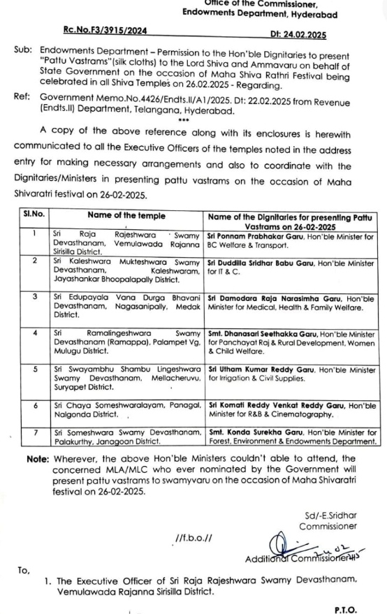 ఈ నెల 26 న మహాశివరాత్రి పర్వదినం సందర్భంగా ప్రముఖ ఆలయాలకు ప్రభుత్వ పక్షాన పట్టు వస్త్రాలు సమర్పించే మంత్రుల పేర్లు, ఆలయాలను ప్రకటిస్తూ ప్రభుత్వం ఉత్తర్వులు జారీ చేసింది. దేవాదాయ శాఖ కమిషనర్ శ్రీధర్ ఈ ఉత్తర్వులు జారీ చేశారు.