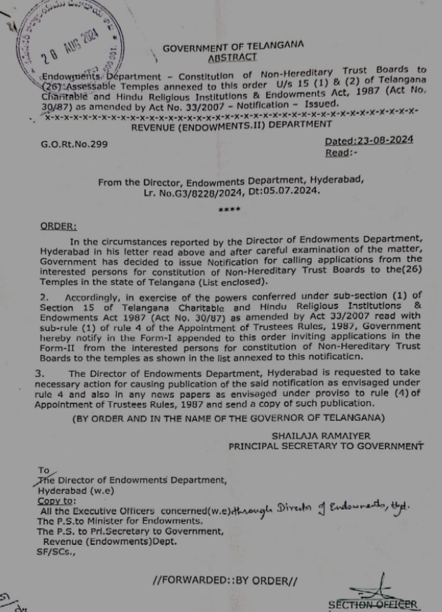 రాష్ట్రంలో ప్రముఖ 26 ఆలయాలకు ప్రభుత్వం పాలకవర్గ లు ఏర్పాటు కోసం ప్రభుత్వ కార్యదర్శి సీనియర్ ఐఏఎస్ అధికారిని రామ శైలజ అయ్యంగార్, ఆగస్టు 23, 2024, న G.ORt. No 229 . పాలకవర్గ ఏర్పాటుకు జీవో జారీ చేశారు.
