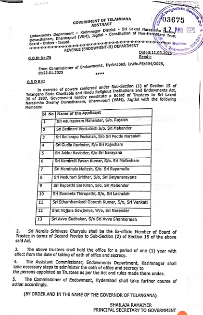 ప్రముఖ పుణ్యక్షేత్రమైన ధర్మపురి శ్రీ లక్ష్మీనరసింహస్వామి ఆలయానికి ఆరు సంవత్సరాల తరువాత ప్రభుత్వం పాలక మండలి ఏర్పాటు చేసింది. స్థానిక ఎమ్మెల్యే ప్రభుత్వ విప్ లక్ష్మణ్ కుమార్ చొరవతో పాలకమండలి ఏర్పాటయింది.
