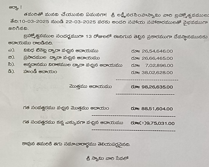 గత సంవత్సరము కన్న అధికంగా వచ్చిన ఆదాయము ₹ 9,75,031/- అని ఈవో ప్రకటనలో పేర్కొన్నారు.