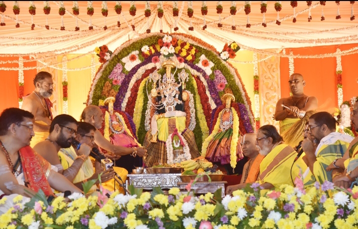 దాదాపు నాలుగున్నర ఎకరాల విశాలమైన శ్రీ మఠం మైదాన ప్రాంగణంలో నూతనంగా ఏర్పాటు చేసిన కళ్యాణ వేదిక పై స్వామి వారి కళ్యాణం తిలకించడానికి దాదాపు పదివేల మందికి పైగా భక్తజనం కూర్చుండి తిలకించేలా కంపార్ట్మెంట్లు ఏర్పాటు చేశారు. కళ్యాణ మైదానం కు దాదాపు అర కిలోమీటర్ దూరం ( తెలుగు కళాశాల , గంపల వాడ ) వరకు భక్తజనం పోటెత్తారు. భక్తుల సౌకర్యార్థం ఆరు ఎల్ఇడి స్క్రీన్ ఏర్పాటు చేశారు.