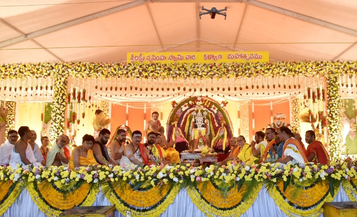 శ్రీ లక్ష్మీ నరసింహ స్వామి బ్రహ్మోత్సవాల్లో భాగంగా సాయంత్రం గోధూళి వేళలో శ్రీ యోగ, ఉగ్ర, శ్రీ వెంకటేశ్వర స్వామి వారి కళ్యాణం అంగరంగ వైభవంగా కనుల పండువగా జరిగింది.