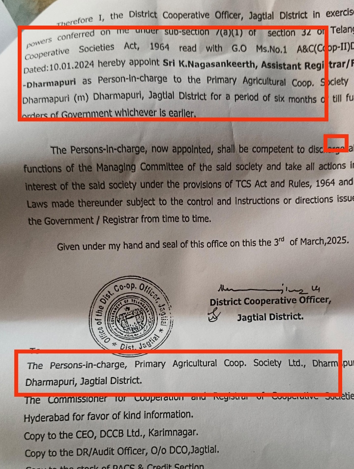 ఈ మేరకు ఈ నెల 3న ఉత్తర్వు సంఖ్య RC. No. 625/ 2025 C ద్వారా జగిత్యాల జిల్లా సహకారం సంఘ అధికారి మనోజ్ కుమార్ జారీచేశారు. దీంతో పాటు, గొల్లపల్లి, తిరుమలాపూర్, పెగడపల్లి సింగిల్ విండో అధ్యక్షుల స్థానం లో పర్సన్ ఇంచార్జి లను ప్రభుత్వం నియమించింది.