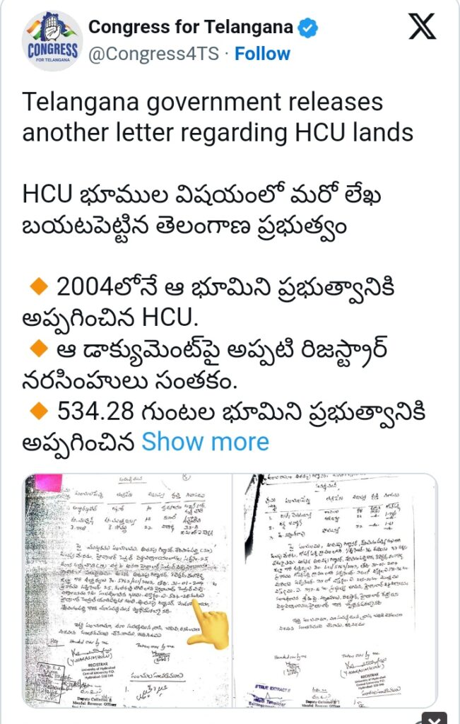 ప్రైవేటు సంస్థకు 21 ఏళ్ల క్రితం కేటాయించిన భూమిని న్యాయపోరాటం ద్వారా ప్రభుత్వం దక్కించుకుంది. అభివృద్ధికి ఇచ్చిన భూమిలో చెరువు (లేక్) లేదు సర్వేలో ఒక్క అంగుళం భూమి కూడా హెచ్సీయూది కాదని తేలింది అని వివరణ ఇచ్చింది. విద్యార్థులను కొందరు కావాలనే తప్పుదోవ పట్టిస్తున్నారని మండిపడింది.