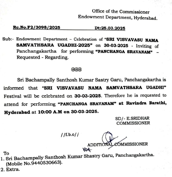 తెలంగాణ ప్రభుత్వ దేవాదాయ శాఖ, సంతోష్ కుమార్ శాస్త్రి నీ పంచాంగ శ్రవణం చేయాల్సిందిగా ఆ శాఖ కమిషనర్ ఆహ్వానిస్తూ లేఖ రాశారు.