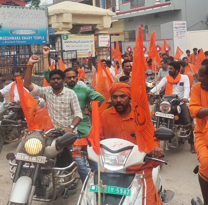 వాహనాలకు కాషాయ జెండాలు, పెట్టుకొని ధర్మపురి క్షేత్రంలో భారత్ మాతాకీ జై, తదితర నినాదాలు చేస్తూ ర్యాలీ నిర్వహించారు.