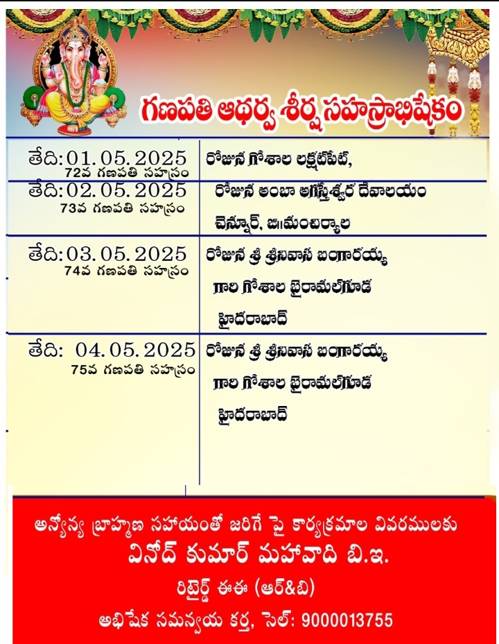 లోక కళ్యాణార్థం అన్యోన్య బ్రాహ్మణ సహాయం తో పవిత్ర గోదావరి తీరమైన మంచిర్యాల జిల్లా లక్షేట్టిపేట్ బ్రాహ్మణ వాడ లోని శ్రీరామగోకులం లో మే 1 న గురువారం శ్రీ వరసిద్ధి వినాయక సహిత శ్రీ రాధాకృష్ణ విగ్రహ స్థాపనలో భాగంగా గణపతి అథర్వ శీర్ష సహస్ర అభిషేకం జరుగుతుందని సహస్ర అభిషేక సమన్వయ కర్తవినోద్ కుమార్ మహావాది తెలిపారు.