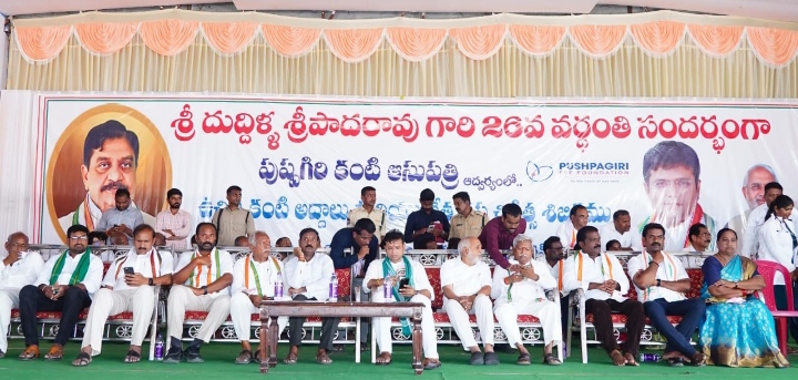 మాజీ సభాపతి శ్రీపాద రావు వర్ధంతి సందర్భంగా పుష్పగిరి ఆసుపత్రి ఆధ్వర్యంలో ఉచిత కంటి పరీక్షలు, అద్దాలు పంపిణీ కార్యక్రమాన్ని బిఎల్ఎం గార్డెన్స్ లో మంత్రి కంటి అద్దాలను పేషెంట్లకు అందచేశారు.