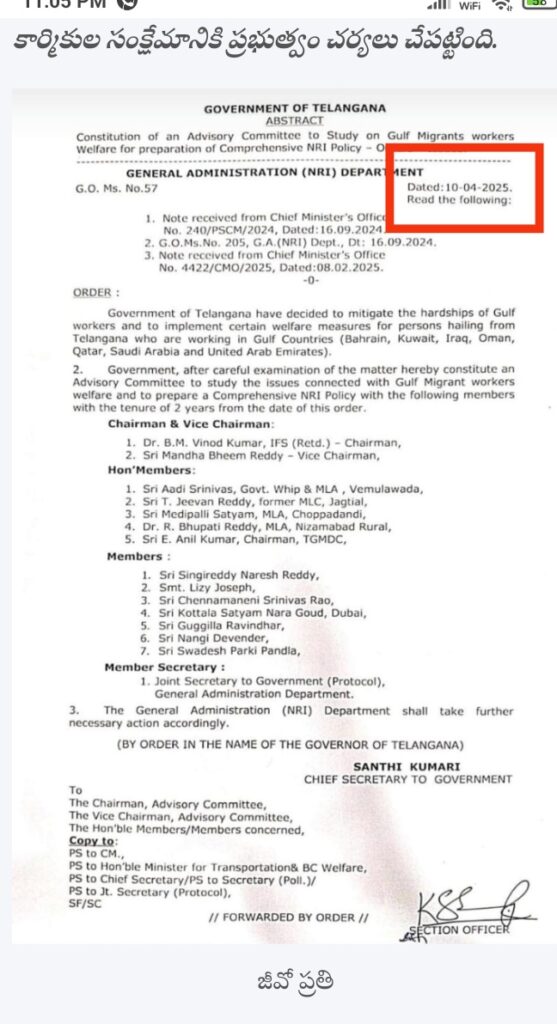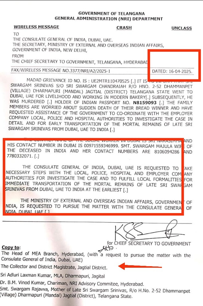 తెలంగాణ ప్రభుత్వ చీఫ్ సెక్రెటరీ ద్వారా కన్సులేట్ జనరల్ ఆఫ్ ఇండియా దుబాయ్ యూఏఈ మినిస్ట్రీ ఆఫ్ ఎక్స్టర్నల్ అండ్ ఓవర్సీస్ ఇండియన్ ఎఫైర్స్, గవర్నమెంట్ ఆఫ్ ఇండియా న్యూ డిల్లీ కి వైర్ మెసేజ్ ద్వారా ఉత్తర ప్రత్యుత్తరాలు జరిపిన అధికారిక పత్రాలను ప్రదర్శించారు.