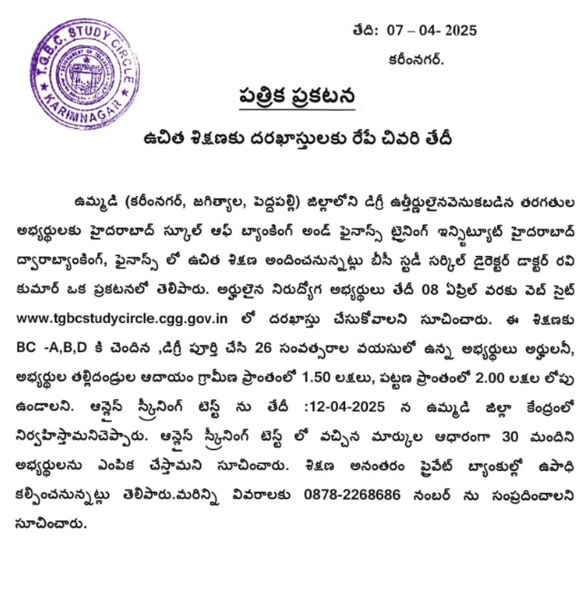 www.tgbcstudycircle.cgg.gov.in లో దరఖాస్తు చేసుకోవాలని సూచించారు.