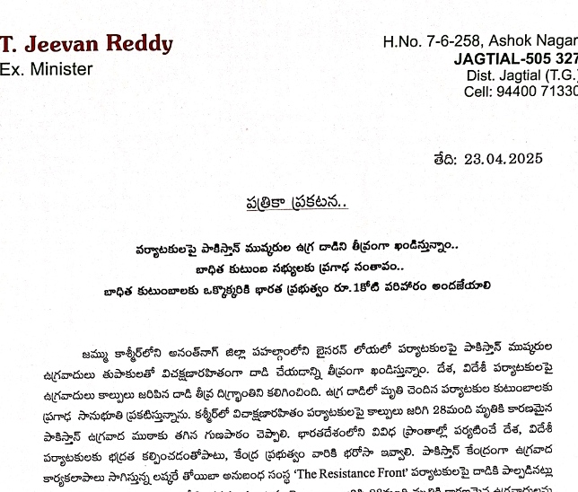పర్యాటకుల పై పాకిస్తాన్ ముష్కరుల ఉగ్ర దాడి అమానుషమని, ఈ దారుణ సంఘటన తీవ్రంగా ఖండిస్తూ, సంతాపం వ్యక్తం చేశారు. బాధిత కుటుంబ సభ్యులకు కోటి రూపాయలు, కుటుంబంలో ఒకరికి ఉద్యోగం ఇవ్వాలని మాజీ ఎమ్మెల్సీ టీ .జీవన్ రెడ్డి కేంద్ర ప్రభుత్వాన్ని డిమాండ్ చేశారు.
